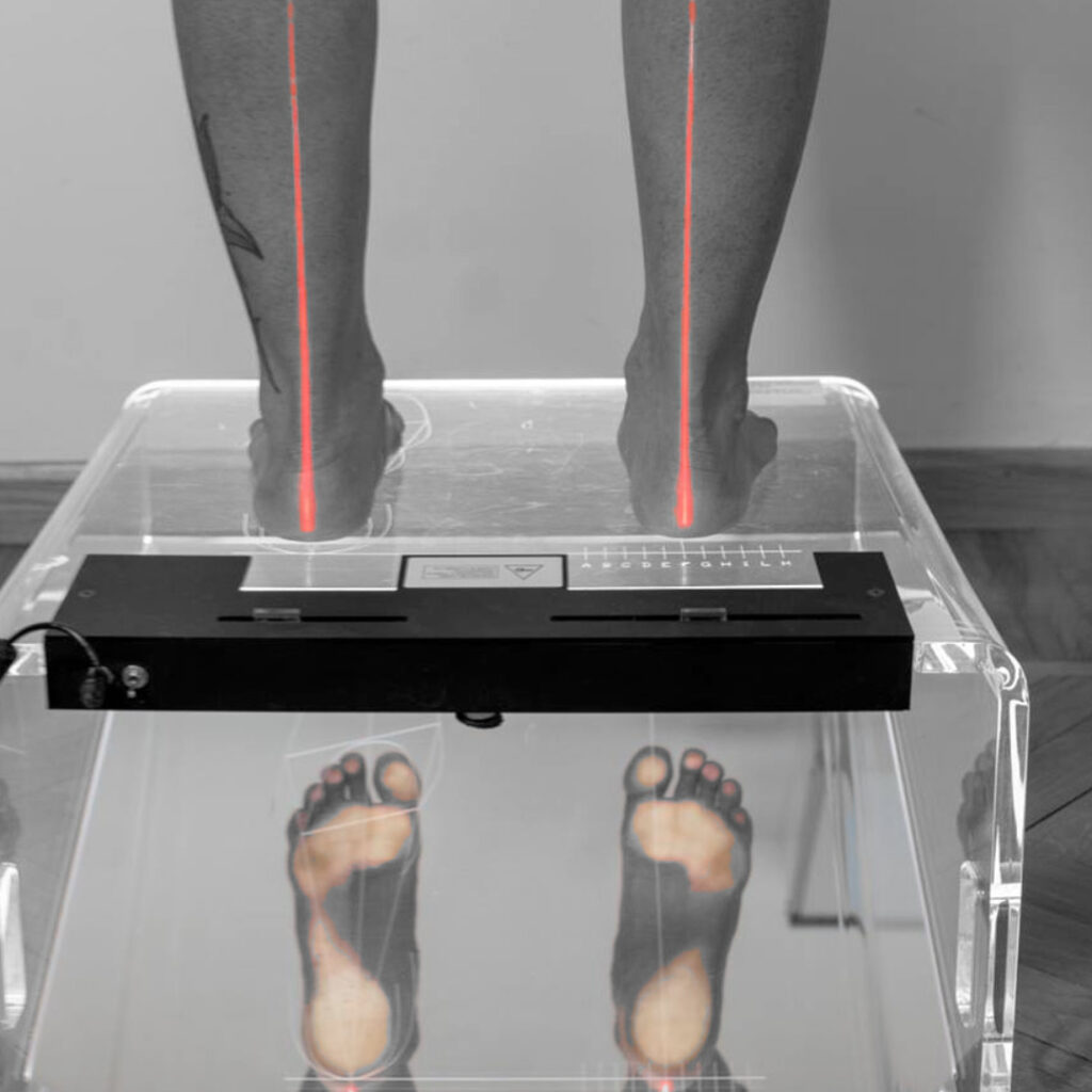 L’analisi prosegue con l’esame al podoscopio LedPodoLaser, che permette di valutare l’appoggio del piede in chiave posturale, evidenziando asimmetrie di carico, adattamenti del bacino e della colonna e zone di sovraccarico.